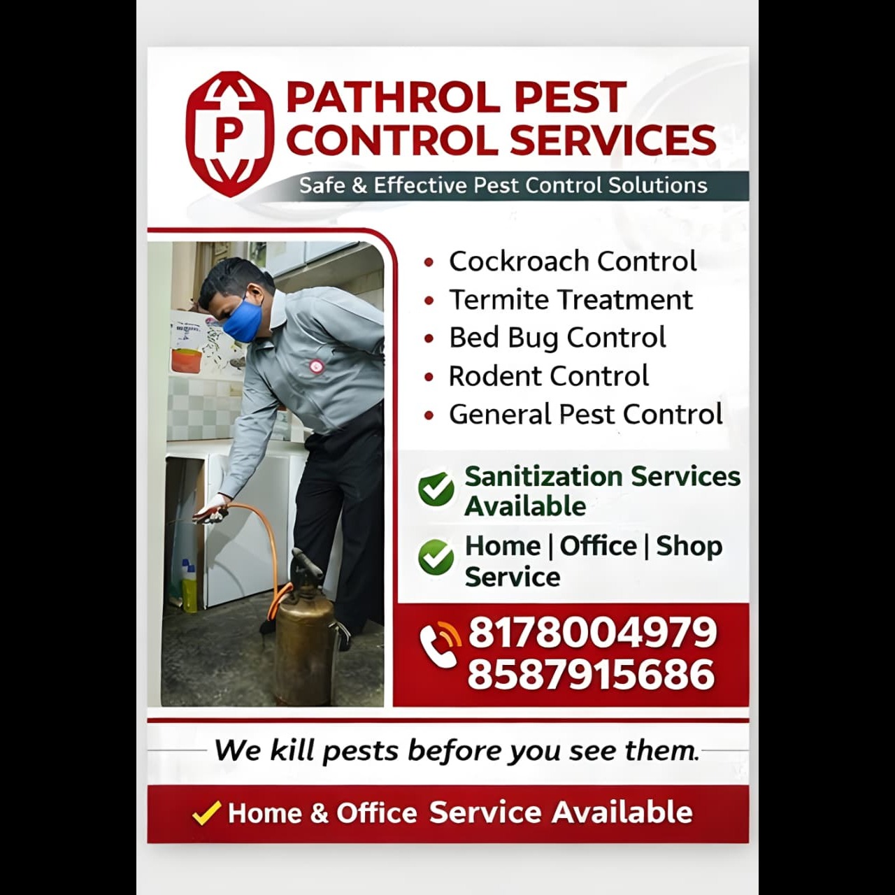 Pathrol Pest Control Services is a Delhi-based company specializing in professional pest management for homes and businesses across the Delhi NCR region. Established around 2018 and located in Sarita Vihar, it focuses on delivering reliable, eco-friendly treatments by certified technicians. [pathrolpest](https://www.pathrolpest.com/about-us) Company Background Pathrol Pest Control Services operates from Sarita Vihar, Delhi, serving areas like Noida, Gurgaon, Ghaziabad, Faridabad, Okhla, Jasola, Lajpat Nagar, and Greater Noida. The company prioritizes quality pest control combined with high customer satisfaction, using government-approved chemicals and modern equipment. Founded as a leading provider in residential and commercial pest services, it has built a strong reputation over the years for thorough inspections and preventive measures. [pathrolpest](https://www.pathrolpest.com/latest-update/pathrol-pest-control-services-offers-reliable-and-effective-pest-management-solutions-across-all-a/191) Services Offered Pathrol handles a wide range of pests including termites, cockroaches, mosquitoes, ants, rodents, bedbugs, and woodborers. They provide customized solutions such as general pest control, termite prevention, mosquito fogging, and long-term protection plans tailored to residential homes, offices, shops, warehouses, schools, and industrial sites. Treatments are eco-friendly, safe for families and pets, and involve targeted applications after detailed inspections to address infestations effectively. [pathrolpest](https://www.pathrolpest.com/latest-update/pathrol-pest-control-services-is-a-trusted-name-in-providing-effective-and-reliable-pest-management/198) Approach and Expertise The team consists of highly trained, certified professionals who use advanced techniques for prompt, efficient service. Pathrol emphasizes root-cause identification, hygiene maintenance, and ongoing protection to ensure pest-free environments year-round. Services are available 24/7 with flexible payment options like cash or cheque, and they offer free inspections for personalized quotes. Pathrol-Pest-Control-Services-Near-By-Kalindi-Kunj-Metro-Stn-Sarita-Vihar Coverage and Commitment Covering all major Delhi NCR localities, Pathrol guarantees 100% satisfaction through affordable pricing and quick response times. Their mission centers on safety, reliability, and creating healthier spaces free from pest-related damage or health risks. Clients appreciate the professional staff's courtesy and the lasting results from customized plans. [pathrolpest](https://www.pathrolpest.com/latest-update/pathrol-pest-control-services-is-a-trusted-name-in-providing-safe-effective-and-affordable/213) This overview draws from Pathrol's official site and listings, highlighting their role as a trusted local expert in pest management. [pathrolpest](https://www.pathrolpest.com/about-us)